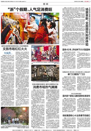 跨界融合加快升级消费体验。我省发布《太平年》《藏海传》等12部首批“剧游浙江”榜单,推出《中国传说·白蛇》等11部春节档浙产微短剧,吸引众多剧粉来浙。省文化广电和旅游厅统筹开展“跟着太平年去旅行”活动,钱王祠等文化地标接待量显著增长。“科技+”引发全民打卡,宇树功夫机器人、无人机“火凤”秀等走进景区,吸引游客驻足围观。“票根+”延展消费链条,各地持续开展“有票就go了”“一张机票游温州”等主题活动。