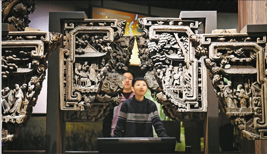 2月23日,市民在东阳市博物馆参观古建筑木雕构件。 共享联盟·东阳 包康轩 摄
