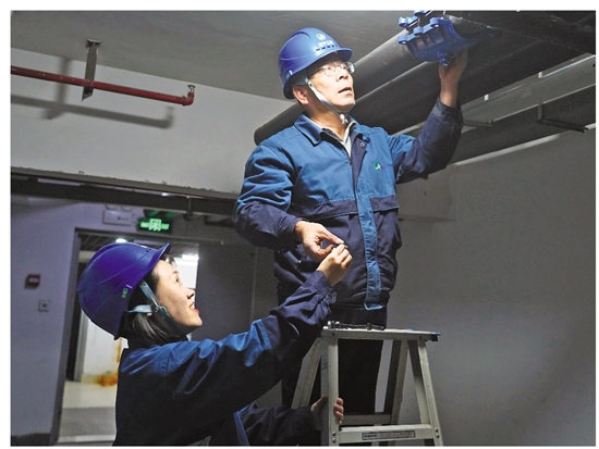记者(左)与胡水清为水管安装哈夫节。 共享联盟·越城 严立明 摄