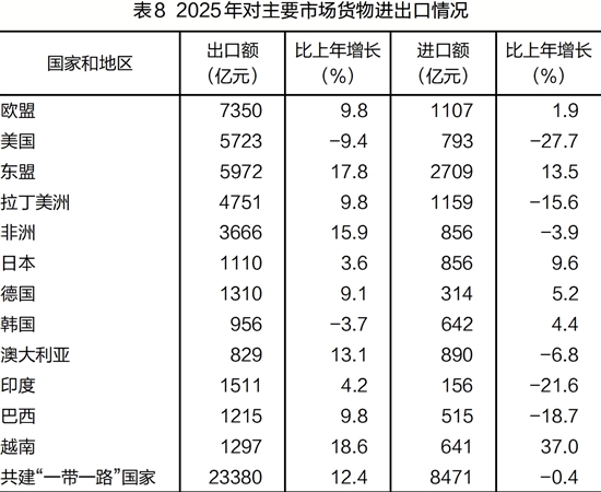 表8 2025年对主要市场货物进出口情况