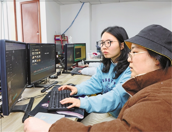 记者(左)跟着动画师赵圆缘(右)用AI平台制作漫剧。