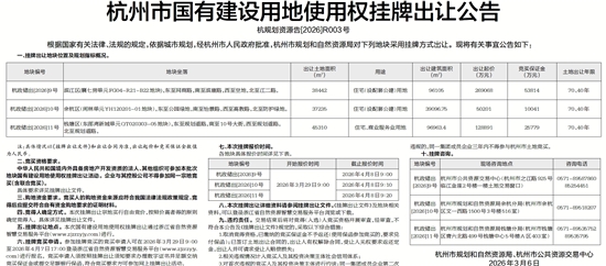 六、挂牌竞买申请。参加挂牌竞买的竞买申请人可在2026年3月29日9∶00至2026年4月7日17∶00登录浙江省自然资源智慧交易服务平台(www.zjzrzyjy.com)进行报名。竞买申请人须按照挂牌出让须知要求办理数字证书并足额交纳竞买保证金或提交足额银行保函,符合竞买要求方可参加网上挂牌出让活动。