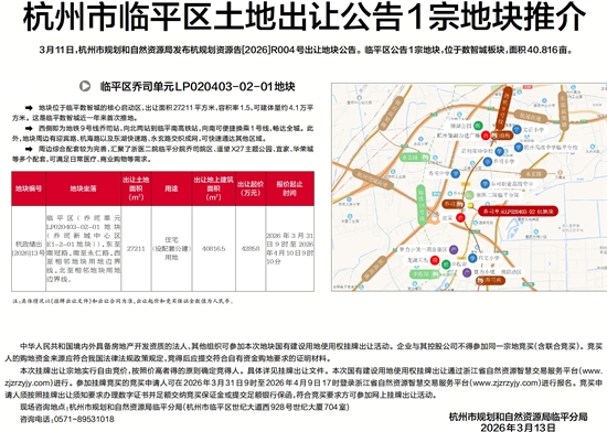 3月11日,杭州市规划和自然资源局发布杭规划资源告[2026]R004号出让地块公告。临平区公告1宗地块,位于数智城板块,面积40.816亩。