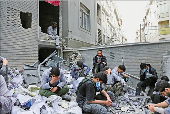 3月15日,在伊朗首都德黑兰一处美以军事行动中遭袭的居民区,当地居民正清理废墟并搜集可用的生活用品。
