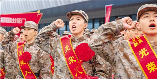 3月17日,宁波市2026年上半年新兵起运仪式在铁路宁波站举行。新兵们身着迷彩服、肩披鲜艳绶带、胸戴大红花,告别亲人和家乡,踏上保家卫国的征程。 本报记者 贺元凯 通讯员 张昊桦 王旭辉 摄