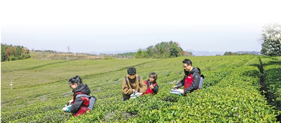 记者金汉青(左二)在“茶保姆”工作人员指导下,用阶梯输送式茶叶采收机采茶。 本报记者 郑培庚 摄