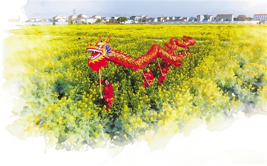 3月12日,在温岭市石桥头镇,当地的女子舞龙爱好者举着红金相间的“中国龙”,在油菜花海中舞动。