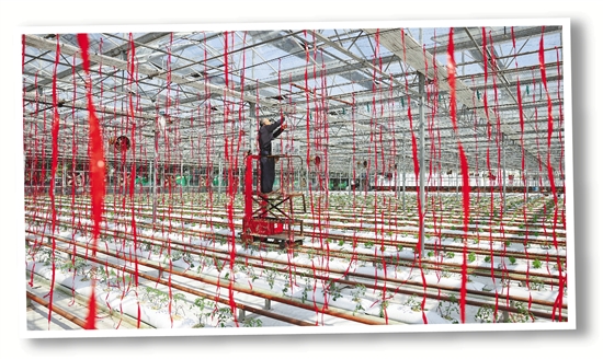 东阳市南马镇花园村现代农业生态园里,工作人员正在全自动玻璃温室大棚内实施固定吊蔓绳作业。 共享联盟·东阳 包康轩 王江红 摄