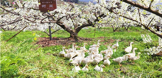 屏山县茵红李林下养殖的白鹅。