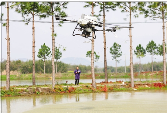 3月25日,在德清县下渚湖街道和睦村,青虾养殖户正操控无人机播撒饲料。使用无人机作业效率比人工播撒提高两倍以上。 通讯员 蔡俊 摄