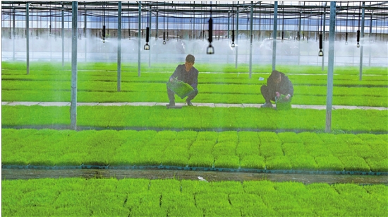 | 3月25日,义乌市佛堂农业双强示范区智能育秧大棚内,农技人员正查看早稻秧苗长势。大棚内配备了先进的水肥一体化智能灌溉系统和温度调节系统,显著提升了秧苗的品质与成活率。 本报记者 董旭明 通讯员 吕斌 摄 |