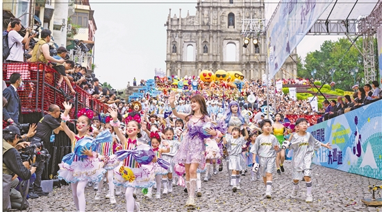3月29日,2026澳门国际幻彩大巡游举行。大街小巷间,海内外表演队伍载歌载舞,尽显澳门多元文化荟萃的城市风采。图为表演队伍在2026澳门国际幻彩大巡游上。