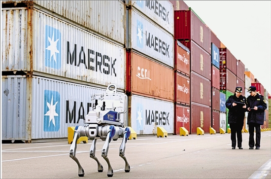 宁波海关关员运用机器狗对进境空箱进行查验。 通讯员 洪韵 摄