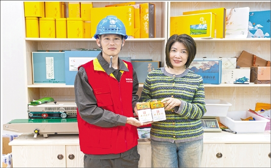 供电公司工作人员为茶户送来安吉白茶分时碳足迹标签
