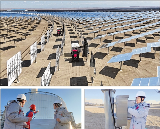 上图:专用清洗车正在清洗定日镜。左下:工程师检查维护熔盐储罐。右下:工程师检修设备。