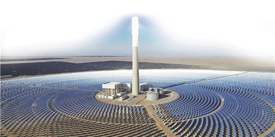 247米高的吸热塔矗立镜场中央,定日镜将阳光精准汇聚,实现光热转换与储能发电。