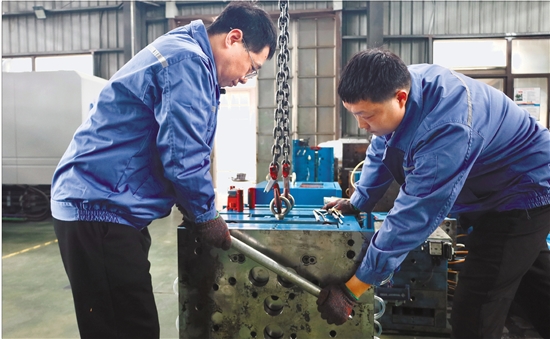 胡东方(左)与徒弟在注塑模具车间进行模具维护。