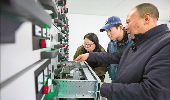 姜振军(右)给记者讲解高低压配电柜的用途。 本报记者 周旭辉 彭鹏 摄