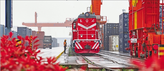 4月1日,金华市金东区铁路金华南货场,一列中欧班列经海关监管后缓缓启程。据中国铁路上海局集团有限公司杭州铁路物流中心统计,今年一季度浙江中欧班列共发运42482个标箱,同比增长21.5%。 通讯员 胡肖飞 摄