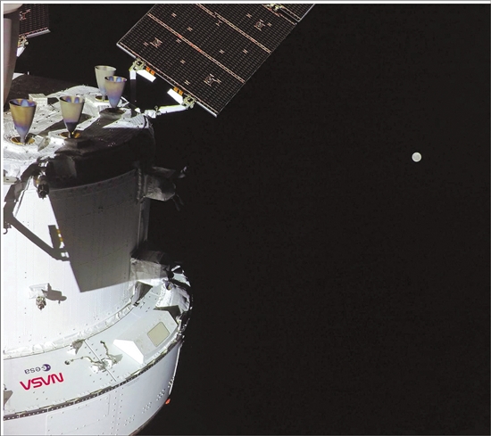这张美国航空航天局提供的图片显示的是执行“阿耳忒弥斯2号”载人绕月飞行任务的“猎户座”飞船和月亮(4月3日摄)。 新华社/美联
