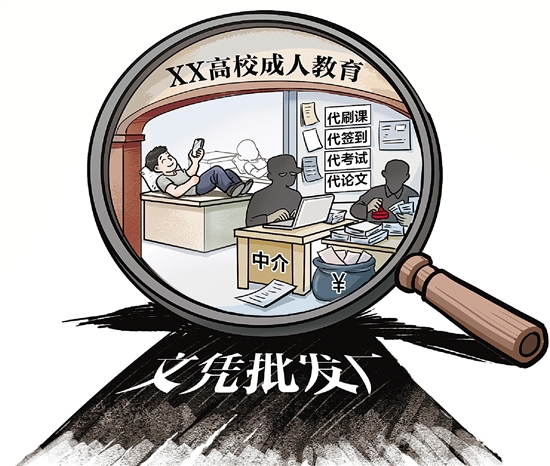 代刷课、代签到、论文代写……部分高校成人教育乱象频发,中介全程“托管”,高校却“睁只眼闭只眼”。学历沦为生意,文凭变成批发,不仅损害了高等教育的公平性和权威性,更透支了社会信任。对此,相关部门应当强化监管、严惩造假,让成人教育回归育人本真。 陈昱志 金妍 作 |