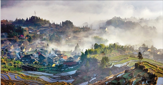 云雾缭绕的云和梯田。 丽水市气象局供图