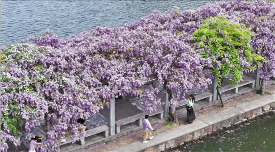 这些天,浙江大学华家池校区的紫藤长廊里,盛放的紫藤花垂挂下来,宛若紫色瀑布。图为4月8日,市民游客在紫藤长廊游览。