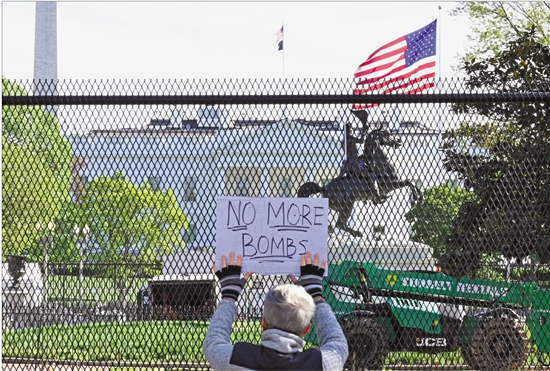4月7日,一名示威者在美国首都华盛顿的白宫前手举标语。 新华社记者 李睿 摄