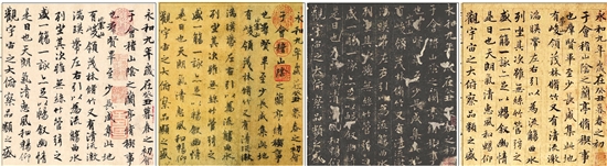 从左至右:《兰亭序》神龙本、虞世南临本、定武本、赵孟頫临本(局部)。