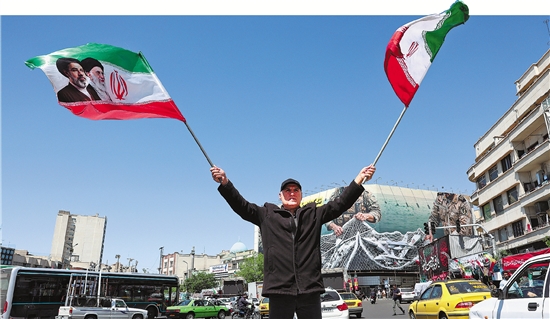 当地时间4月22日,伊朗德黑兰,伊朗男子在解放广场挥舞伊朗国旗。 CFP 供图