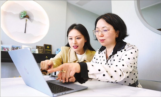 姜淑珍教授教记者张源(左)审核采集到的音频。 本报记者 周旭辉 摄